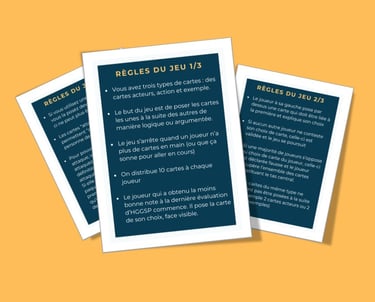 👉 Le mode solo : vous tirez au sort une carte acteur et une carte action, vous devez trouver un exemple qui correspond à ces deux cartes (et vous pouvez varier les types de cartes)